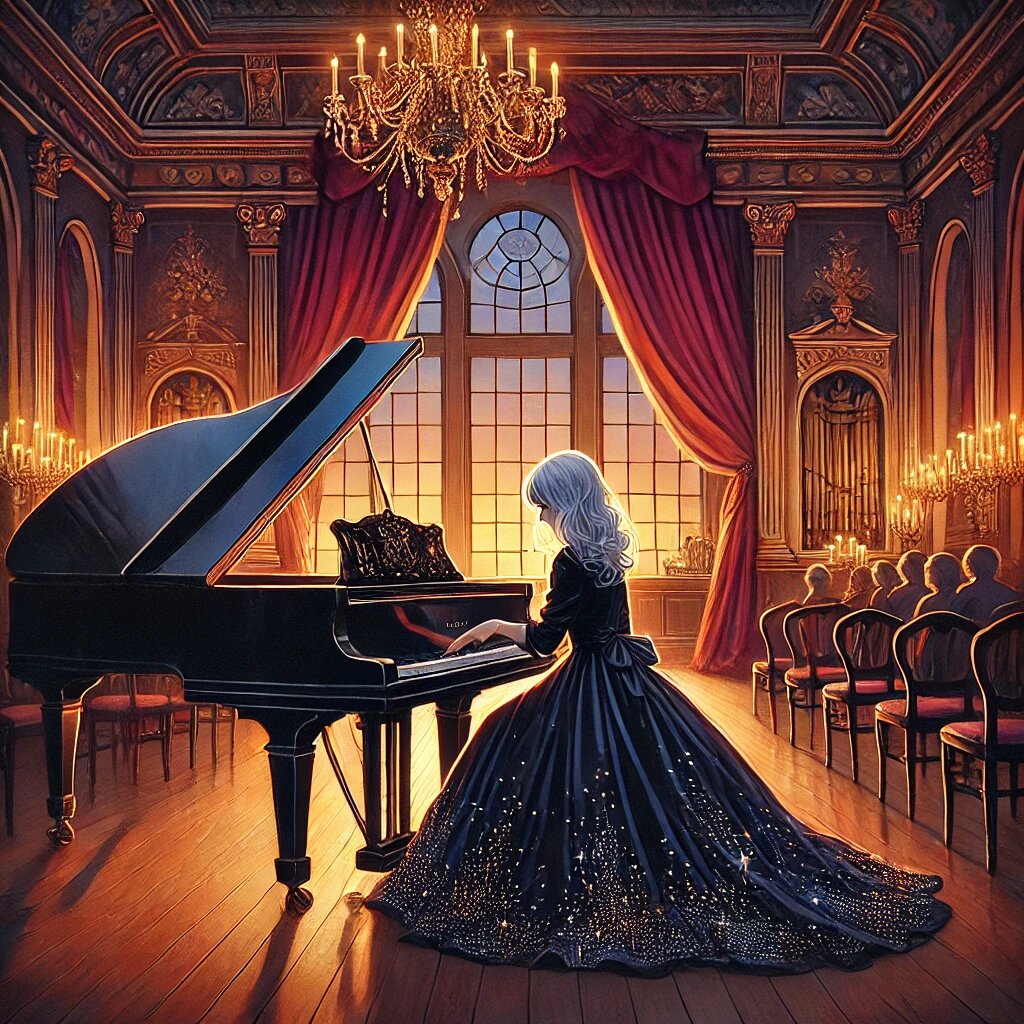 Тонкие изящные пальцы Златы лёгким веером порхали по клавишам рояля. Воздушные неуловимые движения наполняли парадный зал янтарного поместья «Турецким маршем» Моцарта. Чёрный изгиб массивного рояля смотрел в большую бордовую штору, которой был закрыт разноцветный витраж высокого окна. Инструмент был повёрнут так, что девушка сидела боком к зрителям, замершим на разномастных стульях, выставленных рядами, создавая импровизированный партер оперного театра. Её отливающие серебром волосы свободно струились по вздрагивающим плечам, рассыпаясь пепельно-русой лавиной по стройной упругой спине. Вечернее платье цвета тёмно-синего ночного неба переливалось мириадами звëзд-зничек, то появляющихся, то так же внезапно исчезающих на тёмном и бездонном космосе лёгкой материи. Помещение не обладало акустикой специальных залов, но старый рояль из резного дуба наполнял зал объёмом и обволакивал янтарным звучанием. Пальцы замерли в последнем аккорде, и зал зашëлся в плеске ладоней. Злата приподнялась на месте и, прижав руку к груди, склонила голову в лёгком поклоне.