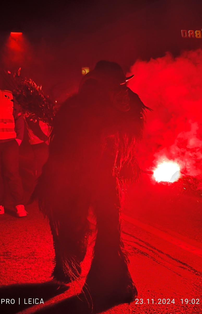 Меня очень растрогали крампусята, которые ходили за ручку со своими родителями. Один был особенно милым. Малыш года три. Он снял рожки и глазки у него были такие жалобные - сонные. Казалось, они говорили - отпустите меня спать наконец-то! Фрау, которая сидела рядом со мной, дала ему конфету, полученную от другого Крампуса. Но, кажется, даже она не очень взбодрила этого сонного чертенка.