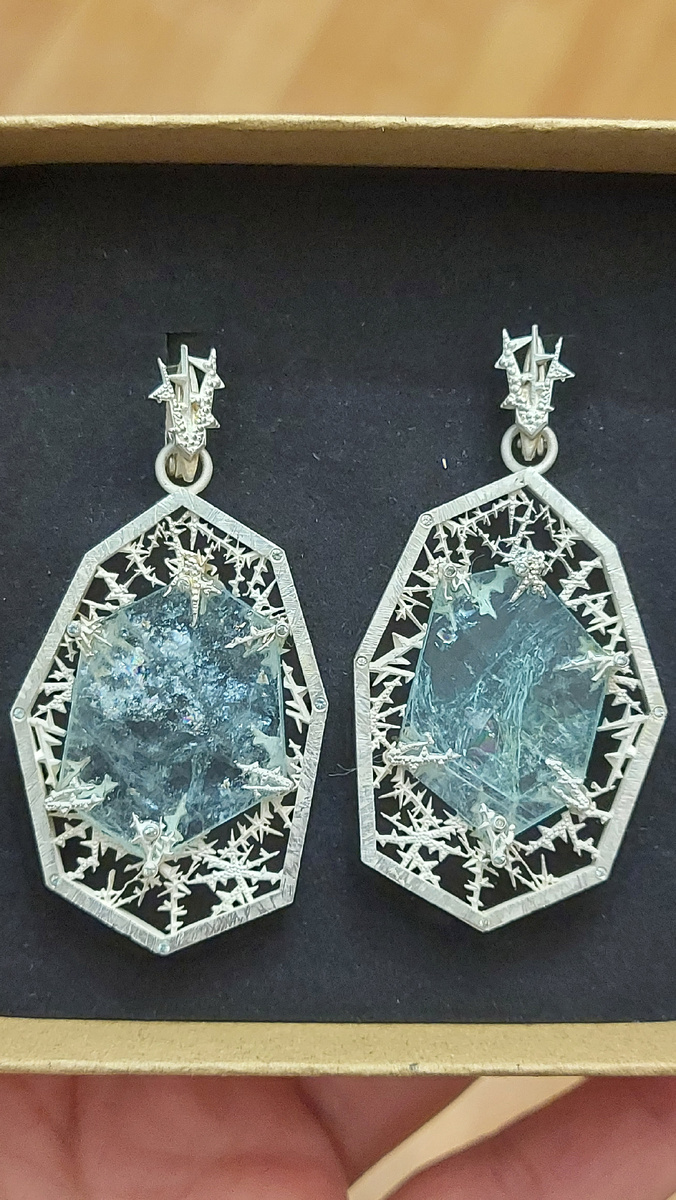 Желаем всем доброго уютного вечера и хороших умиротворяющих выходных, дорогие наши друзья и соучастники!🍀 А мы завершили очень длительную работу на заказ! 🔥Так рады! Так рады! Посмотрите, как красиво получилось! Просто чудо! Серьги-трансформеры "Снежные узоры" являются продолжением нашей серии "Изморозь". Серебро 925°. Очень красивый аквамарин с Шерловой горы. Инкрустированы небольшими гранёными александритами с уральского малышевского месторождения. Подвесные элементы с камнями являются съёмными. Благодаря чему возможна трансформация крупного украшения в изящное и не большое, если этого требуют обстоятельства👌 Следом выложу видео рассказ об этих прекрасных серьгах