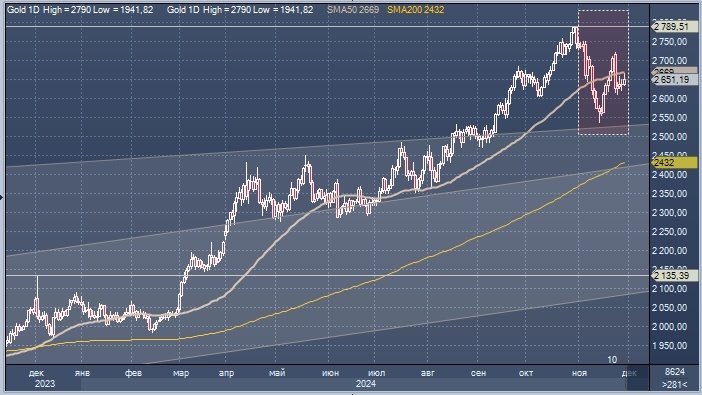 Драгоценный металл подешевел на 3% в ноябре — худший результат за 14 месяцев. График цены наличного золота интервалами в 1 день Цены на золото выросли в пятницу, 29 ноября, в последний торговый день ноября 2024 г., чему способствовало падение доллара и сохраняющаяся геополитическая напряженность. Тем не менее желтый металл завершает последний месяц осени самым существенным падением цены с сентября прошлого года после распродажи, вызванной победой Дональда Трампа на президентских выборах в США. С начала месяца золото упало на 3%, что стало самым серьезным месячным падением с сентября 2023 года, поскольку " эйфория Трампа " привела к росту доллара в начале этого месяца и остановила рост золота, спровоцировав распродажу после выборов. Индекс доллара упал до самого низкого уровня за последние две недели, но по итогам ноября вырос на 2%, поскольку победа Трампа 5 ноября усилила ожидания крупных бюджетных расходов, более высоких пошлин и ужесточения миграционной политики. Золото, рост которо