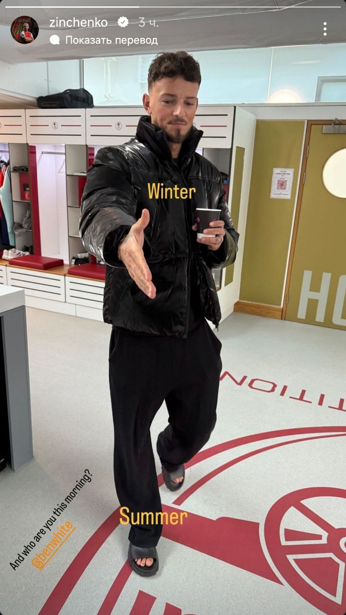 Защитнику «Арсенала» Александру Зинченко всего 27 лет и футбольная карьера в самом разгаре, но если что, украинец точно найдет себя в другом направлении. Например, в моде. В течение суток от Александра досталось двум одноклубникам, причем оба раза как будто по делу. Последние дни в Лондоне установилась типичная ноябрьская погода, а столбик термометра показывает около 7 градусов тепла. Об этом как будто не знает защитник «Арсенала» Бен Уайт, пришел на тренировку одетый не по погоде: сверху утеплился, а на ноги надел сандалии. Зинченко потроллил одноклубника, отметив, что верх у него зимний, а низ − летний. «Кто ты этим утром?» − спросил Александр. На следующий день под раздачу попал Деклан Райс, который переплюнул Уайта: прибыл на базу «Арсенала» в шортах и майке, как будто на улице июль. «Пожалуйста, скажите ему, что через пару дней декабрь», − с такой подписью выложил фото Райса Зинченко. Кажется, что оба англичанина действительно не в курсе, что на дворе почти зима и сейчас самое вре