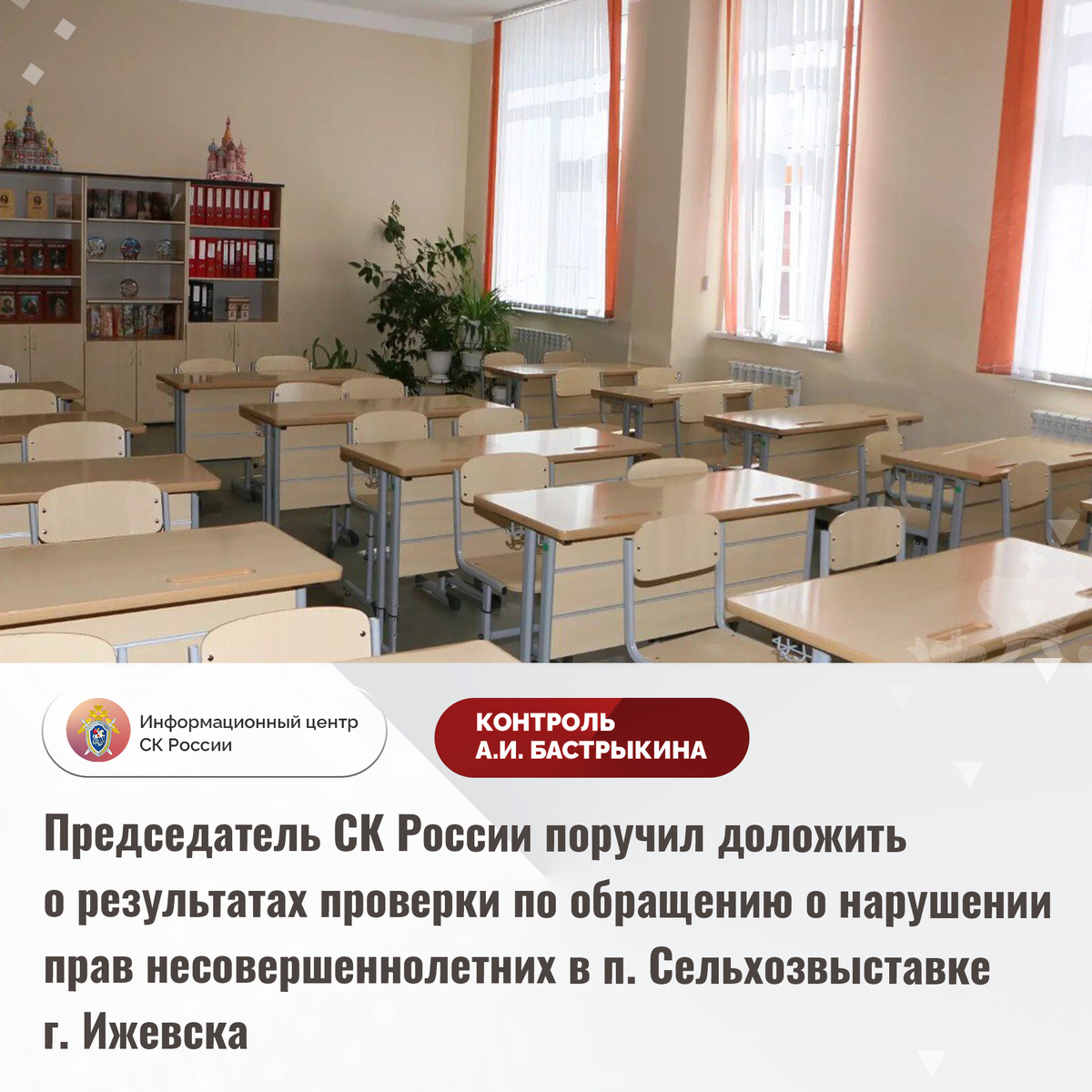 Председатель СК России поручил доложить о результатах проверки по обращению о нарушении прав несовершеннолетних в п. Сельхозвыставке г. Ижевска В комментариях в аккаунте Информационного центра СК России «ВКонтакте» обратилась жительница Удмуртской Республики о нарушении прав несовершеннолетних жителей поселка Сельхозвыставка города Ижевска. В населенном пункте отсутствуют образовательные учреждения, подвоз несовершеннолетних в близлежащие школы не осуществляется. В связи с этим дети вынуждены ежедневно самостоятельно добираться до учебных заведений на переполненном общественном транспорте. При этом при возвращении по месту жительства им приходится в темное время суток пересекать неосвещенную лесополосу. Женщина отмечает, что на территории поселка проживает большое количество лиц, ведущих асоциальный образ жизни и мигрантов, в связи с чем родители опасаются за безопасность школьников. Обращения граждан в местную администрацию с просьбами организовать перевозку несовершеннолетних с помощ