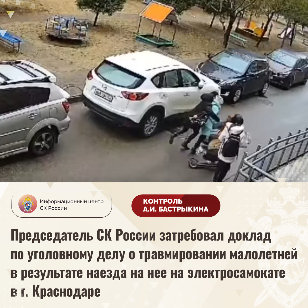 Председатель СК России затребовал доклад по уголовному делу о травмировании малолетней в результате наезда на нее на электросамокате в г. Краснодаре В СМИ сообщается, что 27 ноября текущего года в городе Краснодаре местная жительница, передвигавшаяся на средстве индивидуальной мобильности со своим ребенком, сбила 12-летнюю школьницу во дворе многоквартирного дома по улице Академика Лукьяненко, после чего скрылась с места происшествия. Пострадавшая получила телесные повреждения, ей потребовалась медицинская помощь. В СУ СК России по Краснодарскому краю по данному факту возбуждено уголовное дело. Председатель Следственного комитета Российской Федерации Александр Иванович Бастрыкин затребовал у руководителя СУ СК России по Краснодарскому краю Андрея Константиновича Маслова доклад об установленных в ходе первоначальных следственных действий обстоятельствах, а по завершении расследования уголовного дела – о его результатах. Исполнение поручения поставлено на контроль в центральном аппарате