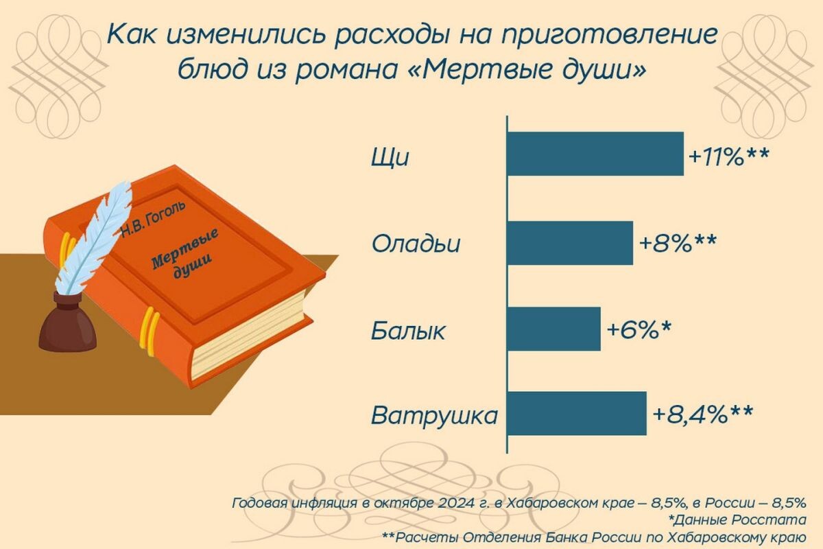 В ноябре исполнилось 40 лет со дня выхода на экран советского кинофильма по роману Н.В. Гоголя «Мертвые души» (12+). Это хороший повод вспомнить приключения авантюриста Чичикова, пересмотрев популярный в свое время «сериал» или перечитав знаменитое произведение. А экономисты Отделения Банка России по Хабаровскому краю решили выяснить, как в октябре 2024 года изменились расходы на приготовление блюд, которыми угощали главного героя старосветские помещики. В расчетах использованы данные Росстата о средних ценах в Хабаровском крае за октябрь 2024 и 2023 годов.