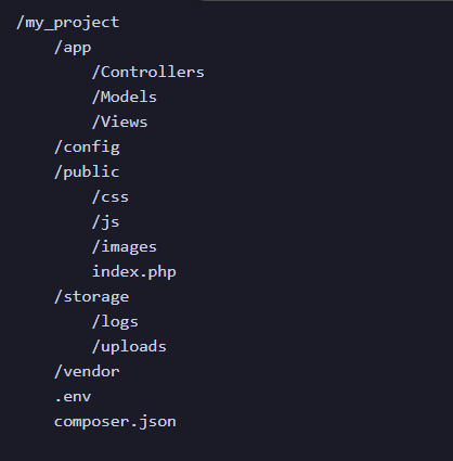 Организация структуры папок и файлов в проектах на PHP имеет большое значение для удобства работы, поддерживаемости кода и безопасности приложения. В данной статье мы рассмотрим рекомендации по правильному расположению папок и файлов в PHP-проектах. Стандартная структура папок может выглядеть следующим образом: В этой папке размещается основная логика вашего приложения: Содержит файлы конфигурации вашего приложения, такие как настройки базы данных, параметры кэширования и другие глобальные настройки. Эта папка должна служить корнем вашего веб-сервера. Она содержит все статические файлы (CSS, JavaScript, изображения) и файл index.php, который обрабатывает входящие запросы. Это важно для обеспечения безопасности, так как доступ к файлам приложения (например, к контроллерам и моделям) должен быть ограничен. Здесь хранятся файлы, которые приложение может создавать во время работы, такие как логи и загружаемые пользователями файлы. Важно, чтобы эта папка была защищена от прямого доступа чер