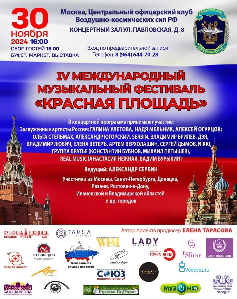 30 ноября 2024, IV Международный музыкальный фестиваль «Красная площадь 2024». Начало в 16-00 Сбор гостей 15-00 Фотосессия, интервью у пресс-вола. Главная тема фестиваля – патриотизм, любовь к Родине. Место проведения: Москва, Центральный офицерский клуб Воздушно-Космических Сил РФ - ,http://clubvks.ru город Москва, ул. Павловская дом 8 (м. Серпуховская или м. Добрынинская)
