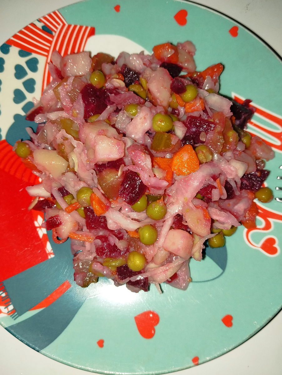 Друзья мои, сегодня приготовим самый обычный, классический винегрет. Для этого салата нам понадобится: Свёкла вареная 1 шт Морковь вареная 1 шт Картофель варёный 4 средних шт Огурец солёный 3 средних шт Квашеная капуста 200 гр Лук 1 небольшая головка Банка консервированного горошка Картофель порезали Следом морковь Добавляем горошек Также квашеную капусту Лучок и огурчик , чтоб не скучали Свеклу, соль по вкусу и немного растительного масла Салат готов! Приятного аппетита! 🤗