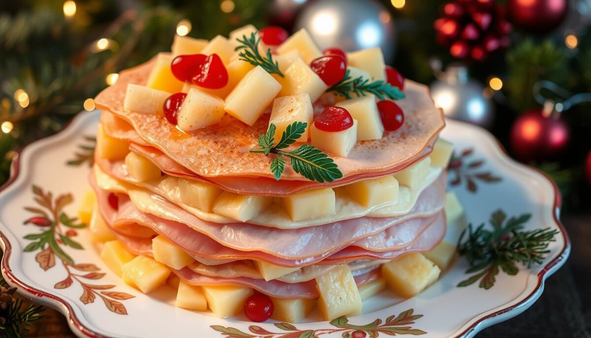 Закусочный "Наполеон" с сыром, ветчиной и ананасом. новогодние рецепты 2025