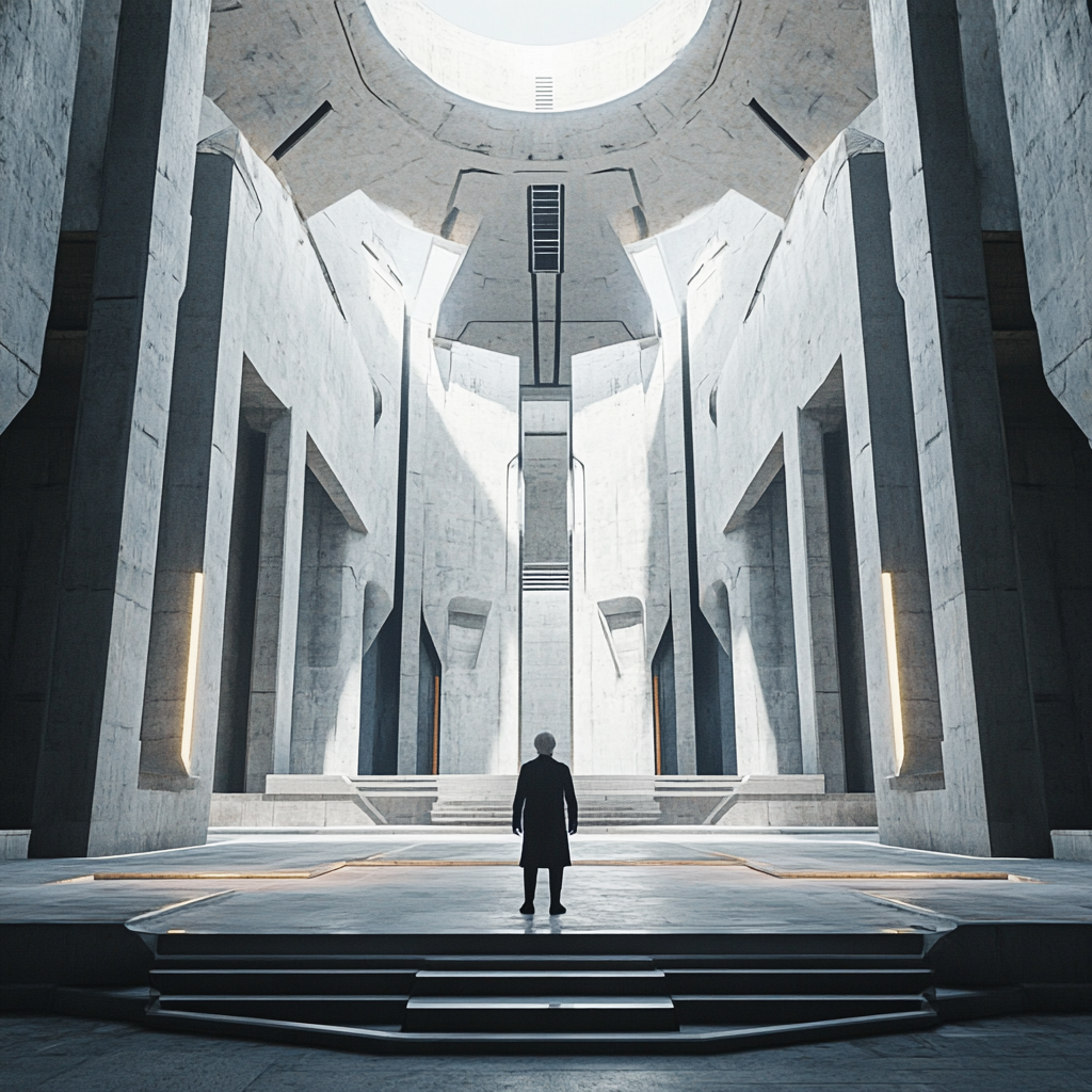 В центре, окружённый кругом металлических панелей, стоял профессор. Его фигура казалась странно маленькой в этом огромном зале, но его осанка излучала уверенность.