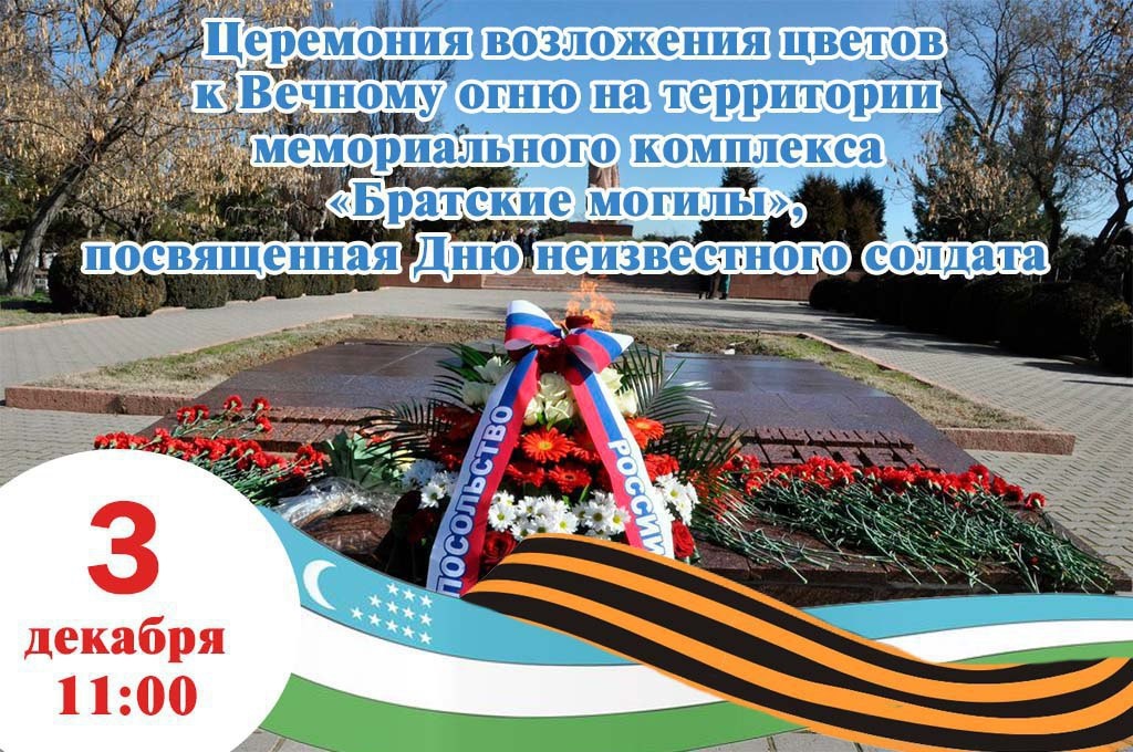 3 декабря в 11:00 на территории мемориального комплекса "Братские могилы" пройдет церемония возложения цветов к Вечному огню. Русский дом в Ташкенте приглашает всех желающих почтить память героев.