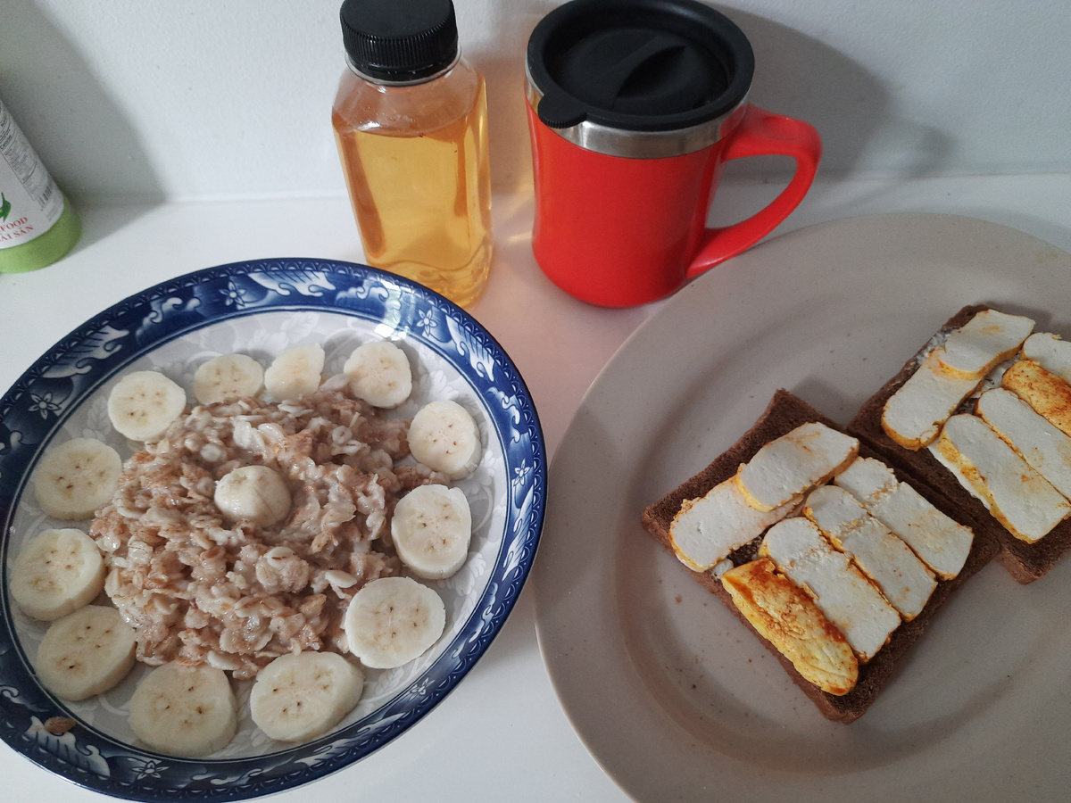 Но перед этим надо подзаправиться). На завтрак я сварила овсянку, ели ее с бананами и медом. Вместо сыра на бутеры положила тофу. В принципе, тофу это и есть сыр, только соевый. А по вкусу он как омлет. Тоже вариант!