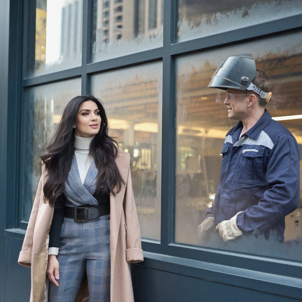 Он был типичным рабочим - крепким парнем с руками, помнящими каждый изгиб металла, с лицом, на котором усталость смешивалась с какой-то внутренней силой. Она - хрупкая девушка в строгом офисном костюме, которая казалась инородным элементом среди грузных фигур сварщиков и слесарей.