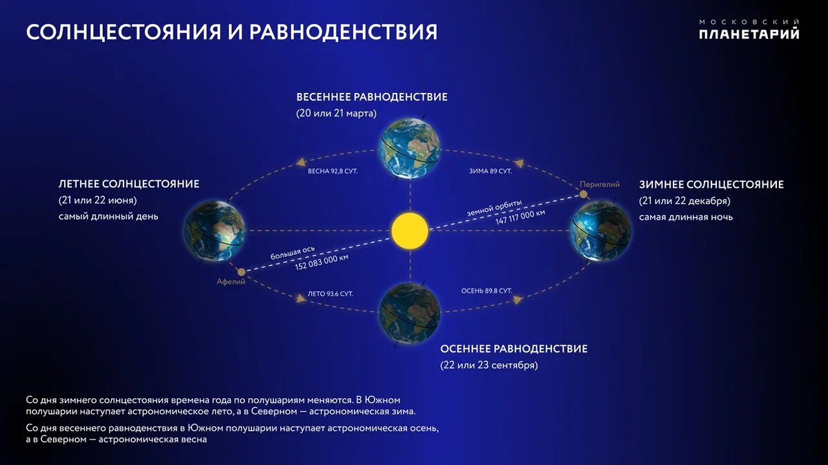 Солнце до 17 декабря движется по созвездию Змееносец, а затем переходит в созвездие Стрелец. Склонение центрального светила 21 декабря 2024 года в 12:00 мск достигает минимума (23,5 градуса к югу от небесного экватора) это момент зимнего солнцестояния. Продолжительность ночи в Северном полушарии Земли максимальна, а продолжительность дня – минимальна: в начале декабря она составляет 7 часов 27 минут, 21 декабря составляет 6 часов 59 минут, а к концу месяца день увеличится до 7 часов 06 минут. День зимнего солнцестояния – самый короткий световой день года в Северном полушарии Земли. После него каждый последующий день будет дарить нам немного больше света. В самую длинную ночь родится новый световой год. К новому году, к 01.01.2025, продолжительность светового дня увеличится на 7,5 минут! 1 декабря (09:22 мск) – новолуние 8 декабря (18:28 мск) – первая четверть 12 октября – Луна в перигее своей орбиты на расстоянии 365358 км от Земли 16:20 15 декабря (12:03 мск) – полнолуние 23 декабря (