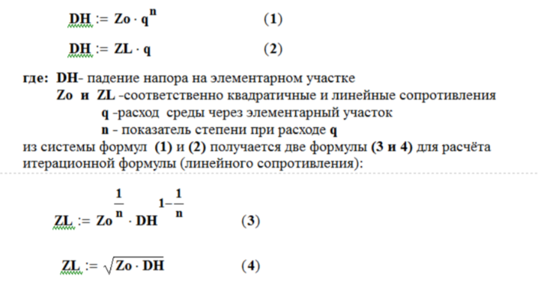 При n=2 формула (3) превращается в (4), такой формулой удобно пользоваться когда падения напоров на элементарных участках схемы имеют только квадратичную зависимость: DH=Zo*q^2.