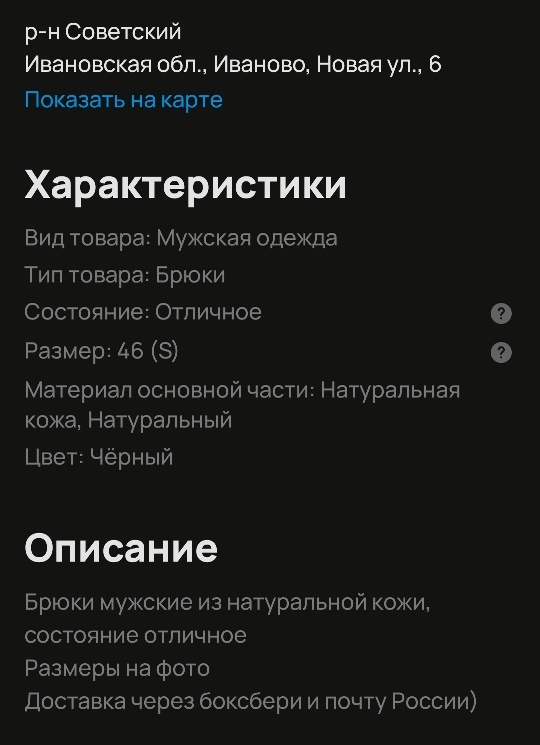 Привет! 😎✌ Давненько ничего не писал, т.к. начал вести второй канал он называется "Кожаный инвестор". Там я рассказываю о кожаных вещах, способах заработка, своих увлечениях и вообще о своей жизни. И так уж получилось, что он стал моим основным каналом. Прошу вас, мигрируйте туда 😉. К концу лета я решил порадовать себя новой обновкой. Кожаные штаны решил смотреть на известном сайте объявлений. В параметрах указал диапазон цен от 1 тысячи до 4 тысяч рублей. И нашёл! Цена 3.000 рублей Сбоку по всей длине интересная кожаная вставка 🙂