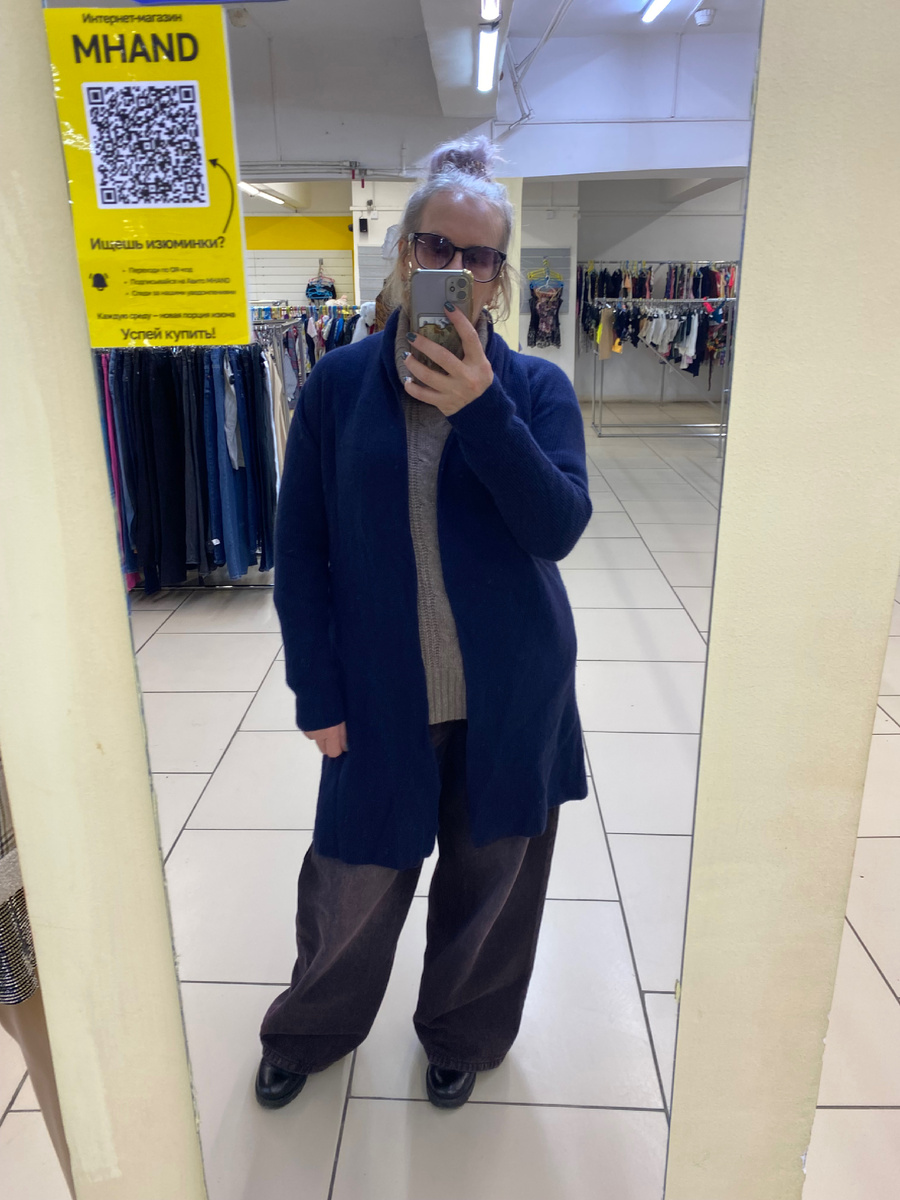 Длиный, классный кардиган очень темно синего цвета из 100% кашемира.