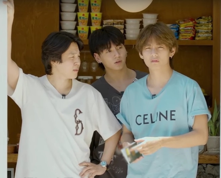 Сначала нам показывают, как Чонгук встречает Тэхёна и везет его к месту съемок: Следующие сцены происходят в кафе - помните, как Чонгук с Тэхёном забыли Чимина в машине, а потом Чимин босиком бегал за Тэхёном, пытаясь угостить того вкусняшкой? То самое место. Чонгук пытается согнуть ложку, но не силой мысли, а руками. Не, не вышло. Зато повеселились: Чимин казался эдакой "тихой грустью" на этих съемках (пока не помчался за Тэхёном) и ничего не ел, а оказалось, что он просто накануне объелся в гостях у Чонгука: Потом Чимин решил, что как-то скучно, и они с Тэхёном принялись разыгрывать сцену воспоминаний о Чеджу - раза два переигрывали и очень веселились. А что в это время делал Гуки? А Гуки слушает, да ест: Гуки на автодроме: Ищут новые ракурсы съемок: Купание в бассейне: Сцены в доме, когда Чонгук решил приготовить еду для стаффа, а остальные просто отдыхали: Чонгук для начала собрал все три микрофона, нацепил их на себя и установил две камеры. Очень доволен: Позирует для двух камер: