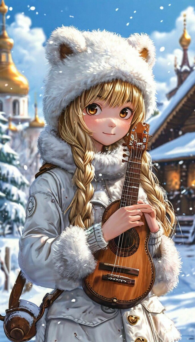 Cute girl with long blonde hair, wearing a fur hat with earflaps and a warm white fur coat, holding a balalaika and samovar in her hands, with a blush on her cheeks, background: snow-covered forest, village hut, golden domes of the church on the horizon, anime style, inspired by the works of artist Hayao Miyazaki, high quality, detailed, 4k, 8k Япония