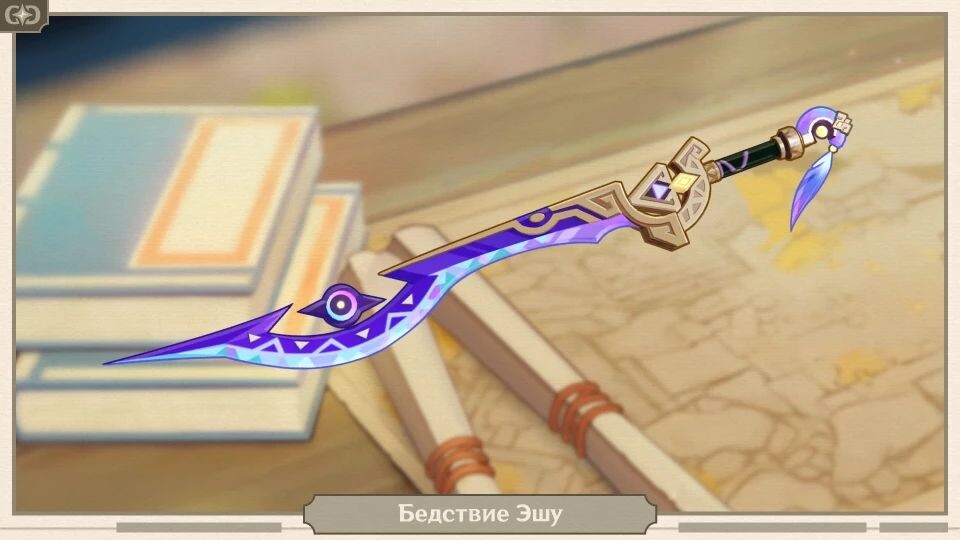 ㅤВ оружейный баннер часто добавляют эксклюзивное эпическое оружие, получить которое можно только из Молитвы. В сегодняшней статье мы расскажем об оружии, добавленном в версии 5.2 игры Genshin Impact. «Церемониальный клинок, выкованный великим жрецом Повелителей Ночного Ветра Санхаджем. В сказаниях прошлого проводил этим изогнутым клинком ритуалы, стирая границу между Царством Ночи и настоящим миром» Редкость: 4★ Способ получения: В событии «Свитки поиска жухов Иктомии» Тип: Одноручное Базовая атака на 90 уровне: 565 Доп. стат на 90 уровне: 27,6% Силы атаки Пассивная способность с 1 по 5 пробуждение: Надвигающийся рубеж ㅤПовышает урон обычной и заряженной атаки на 20-25-30-35-40%, а также шанс крит. попадания обычной и заряженной атаки на 8-10-12-14-16%, если персонаж защищён щитом. Общее количество материалов, необходимое для прокачки Бедствие Эшу до 90 уровня: Материалы возвышения оружия: Материалы возвышения оружия для Бедствия Эшу можно получить в подземелье Древний до