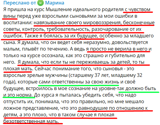 Как представила, с какой тяжестью жила Марина десятки лет! Представьте — годами чувствовать себя виноватой перед своими детьми и верить в то, что переживание за детей=хорошая мать. 🙈 А ещё страшнее, что это у нас заложено на подкорке Если не тревожишься за детей, то ты плохая мать. Если не контролируешь их каждый шаг — безответственная. Не помогаешь — стерва. Эти мысли разрывают нас в клочья и причиняют такую дикую боль! Но и этого мало — они убивают здоровые рефлексы наших детей и заставляют их идти по пути, который уводит их от себя. 😭 Читаю и плачу Если вам также больно, как и мне даже от прочтения этого отзыва, то это значит вы на себе прочувствовали эту боль, как и я когда-то. И что вы на самом деле — хорошая мама. Потому что хотите добра своим детям. 🏃🏼 И ваш следующий шаг — дать возможность своим детям развиваться, расти Чтобы они включили здоровую мотивацию и последовали за своими истинными ценностями. Но важнее для вас на этом этапе — освободить себя. Потому что пока вы са