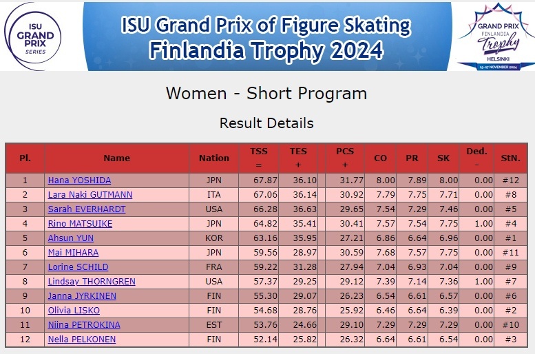 Этап Гран-при, проходящий в столице Финляндии- Хельсинки, резко потускнел после снятия уже известных и имеющих награды Изабо Левито и Луны Хендрикс. Шанс получили другие фигуристки, пробивающие себе путь к медалям. Одно место по замене получила итальянка Лара Наки Гутманн. Рино Матцуике из Японии выступала в первой разминке. Упала с недокрученного тройного флипа и осталась на 4 месте с суммой 64.82 балла, уступив своей соотечественнице Йошиде 3 балла. Американка Сара Эверхардт выступила вслед за Рино Матцуике. Тренируется у Татьяны Малининой (мамы Ильи Малинина- первой победительницы ЧЧК (1999) и финала Гран-при (1999)) и Романа Скорнякова. Справилась со своей программой- прыжки отпрыгала, вращения - 4 уровня, дорожка шагов - 2 уровня. Оценка - 66.28 балла и третье место после короткой. Лара Наки Гутманн из Италии воспользовалась предоставленной возможностью и выступила максимально сосредоточенно, показав уверенный прокат, хотя она только что выступила на этапе в Японии. Коротк