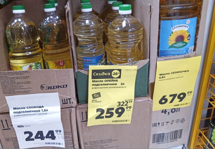 Несмотря на это, растительное масло стало дорожать. Точнее оно уже подорожало. Сегодня самое дешёвое масло в «Пятёрочке», стоившее пару дней назад 85 рублей за 0,9-литровую бутылку, уже стоит 94,5 рубля, поднявшись в цене более чем на 10 процентов.