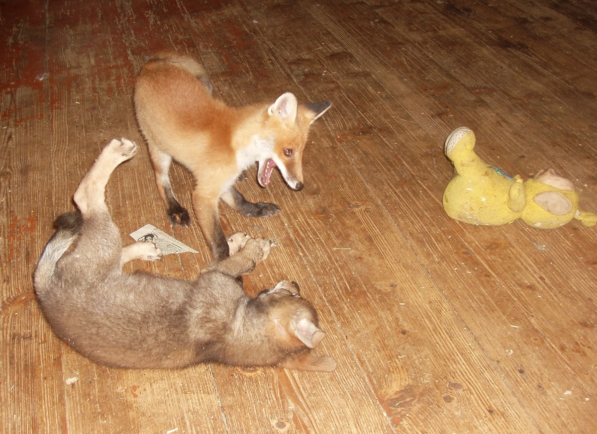 Волчица Грушеньке родилась в нашем Центе и когда ей исполнился месяц, нам принесли маленького лисенка, найденного в подъезде одного из московских домов. Лис был одного возраста с Груней, но если волчонок еще еле ковылял по комнате, то лисенок летал по ней. У зверят было полно разных игрушек, Груня относилась к ним очень бережно, а Лис норовил все унести к себе в клетку и там разодрать на мелкие кусочки. Спали зверята всегда вместе в домашней клетке. Предварительно вечером они устраивали в доме такие игры и наводили такой свой звериный порядок, что мы тратили немало времени на приведение комнаты в нормальный вид.