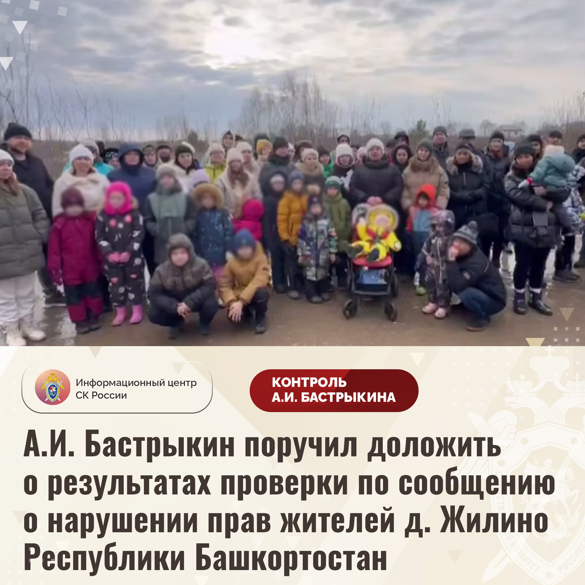 А.И. Бастрыкин поручил доложить о результатах проверки по сообщению о нарушении прав жителей д. Жилино Республики Башкортостан В комментариях в аккаунте приёмной Председателя СК России А.И. Бастрыкина «ВКонтакте» размещено сообщение о несогласии жителей деревни Жилино Республики Башкортостан с планируемым строительством промышленного объекта вблизи жилых домов. Ранее на указанной территории предполагалось возведение школы, однако без учета мнения граждан решение изменено. Многочисленные обращения о необходимости постройки в населенном пункте социальных объектов игнорируются. Указанная ситуация получила распространение в социальной сети. В СУ СК России по Республике Башкортостан проводится процессуальная проверка. Председатель Следственного комитета Российской Федерации Александр Иванович Бастрыкин поручил руководителю СУ СК России по Республике Башкортостан Владимиру Владимировичу Архангельскому доложить о предварительных и окончательных результатах процессуальной проверки. Исполнение