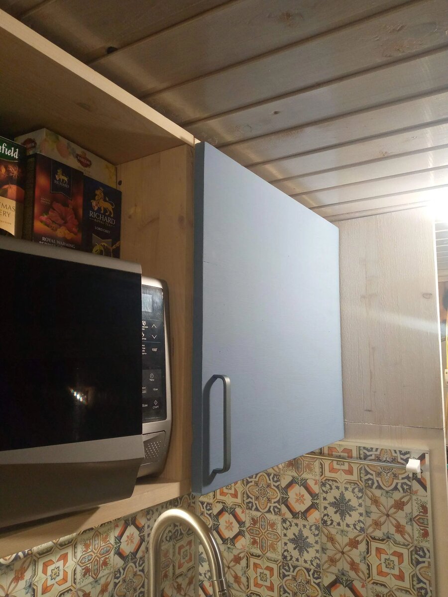 Заказали мы мебельные щиты и столешницу. Столешница у нас получилась из лиственницы. Ну, а пока ждали доставку, начали все разбирать старое. И конечно решили освежить потолок и стены. Я хотела сначала оставить цвет вагонки, который был раньше, в натуральном цвете, но Сережа убедил меня всё перекрасить в более светлый цвет. И он оказался прав. В помещении стало намного визуально просторнее и конечно светлее:
