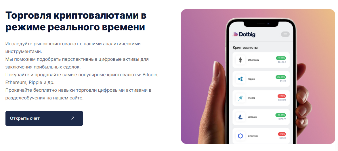 Криптовалютный рынок в последние годы показывает быстрый рост популярности, предлагая инвесторам широкий спектр возможностей для заработка и реализации торгового потенциала. Если грамотно подходить к торговле, то можно получить очень большую прибыль, благодаря высокой волатильности этого цифрового актива. Однако, пропорционально росту потенциального дохода, возрастают и риски. Чтобы их избежать, необходимо выбирать надежного брокера, который станет вашим ключом и откроет все двери на пути к достижению успеха. Брокер DotBig является одной их таких площадок, предоставляя инновационные решения для криптовалютного трейдинга.