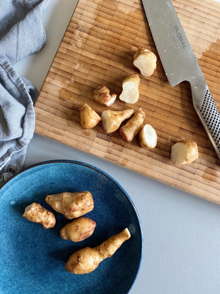 Внешне он похож на помесь имбиря с картофелем, а по вкусу напоминает… грибы! Купив топинамбур один раз, я так впечатлилась его неповторимым вкусом, что начала всё чаще и чаще использовать его в домашнем меню. Но было одно существенное но: чистить топинамбур — сущее мучение! Клубни у топинамбура размером с мелкую картошку, а еще на нем попадаются разные пупырышки… Подумав, я решила проблему так: я его не чищу, а очень тщательно отмываю жесткой стороной губки для мытья посуды. Также у нас есть в продаже специальные варежки и перчатки для очистки топинамбура и других корнеплодов типа молодого картофеля. Очень удобно! Если у вас в стране такие специальные варежки/перчатки для чистки овощей еще не продаются, то просто возьмите обычную перчатку — мочалку для душа.