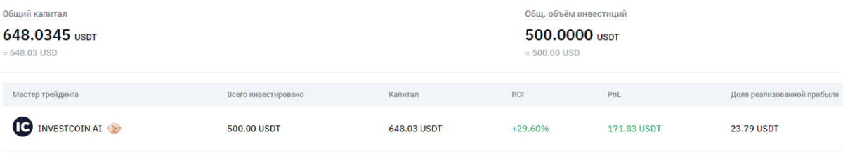 31 марта 2024 года я подписался на копитрейдинг у INVESTCOIN AI. За это время результаты были разными, но финальный итог: почти +30% (или около 50% годовых).