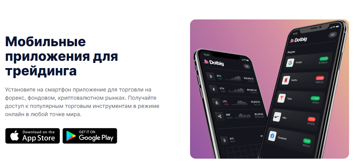 Наш мир не стоит на месте. Развитие происходит ежедневно и мобильные технологии задают тренды, поэтому все компании вынуждены адаптироваться к требованиям времени. DotBig брокер заслуженно занимает место лидера среди таких решений, предоставляя трейдерам все необходимое для успешной торговли. Получить доступ к рынкам активов максимально просто и удобно. От DotBig Forex до инвестиций в акции и криптовалюту — все что нужно, чтобы покрыть любой запрос даже самого требовательного инвестора.