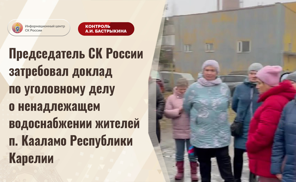 В комментариях в аккаунте приёмной Председателя СК России А.И. Бастрыкина «ВКонтакте» размещено адресованное главе ведомства видеообращение от жителей поселка Кааламо Республики Карелии. Они сообщают, что на протяжении длительного времени вода в жилые дома, объекты социальной инфраструктуры и образовательные учреждения поступает с перебоями, а в настоящее время ее подача вовсе прекращена. При этом подвоз коммунального ресурса организован ненадлежащим образом, так как он непригоден для употребления и использования в бытовых целях из-за содержания хлора, ржавчины и осадка. Ввиду имеющихся нарушений обучение школьников производится дистанционно, проведение медицинских процедур в местной поликлинике приостановлено. Обращения в различные инстанции результатов не принесли.