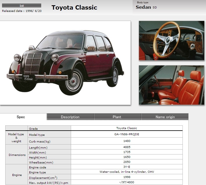 Автомобиль Toyota Classic сделали в 1996 году к какому-то там юбилею Тойоты. Это было похоже на то, если бы Горьковский автозавод захотел сделать Волгу ГАЗ-21 в те же годы....Ну, типа, кузов и салон в старинном стиле сделали и дело осталось только за старинным нижневальным мотором.... Ну, ГАЗ наша гордость, как мы понимаем, найти старинный морально устаревший мотор на ГАЗе всяко смогли бы )) Ну, цимес в том, что и у Тойоты такой мотор нашелся - серии Y, и не долго думая, они в этот ретро-автомобиль тот мотор и воткнули! Модификацию 3Y-E, если быть точным Прикольный проект, когда у компании "больше денег, чем ума"! Ведь совершенно ясно, что описывается это всё простой и ёмкой формулой "казаться, а не быть"! Путеводитель во всем моим статьям Toyota, выбор по моделям: Путеводитель по бензиновым моторам: Путеводитель по дизельным моторам: Если у Вас есть собственные материалы о негативных сторонах этого чудо-авто, пожалуйста, напишите их в коментариях для публикации.