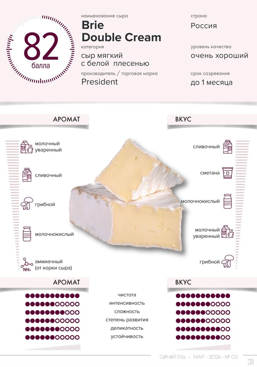 К числу популярных сыров относятся бри, камамбер, рикотта и фета. Как правило, это сыры с высоким содержанием влаги. Они могут быть как свежими, так и выдержанными. Идеальны для намазок, брускетт, добавления в салаты, закуски, как самостоятельное блюдо. • Brie Double Cream, President Внешне привлекательный, сбалансированный во вкусе, с аккуратным ароматическим и вкусовым профилями образец сыра. Особенность сыра - ярко выраженная сливочность. Сыр для самостоятельного употребления, использования в составе брускетт, холодных блюд. • La Paille, De Famille Сыр с тонкой, упругой, сухой, чуть липкой корочкой, без повреждений. Поверхность - чистая, без ослизения. Боковые грани четкие, сыр хорошо держит форму. Цвет сыра на срезе - однородный, интенсивность - выше умеренной. На срезе сыр с глазками овальной и неправильной форм, с распределением по объему сыра. • Mozzarella mini, Сыроварня Волжанка Нейтральная, хорошо сбалансированная во кусе моцарелла с молочным ароматическим проф