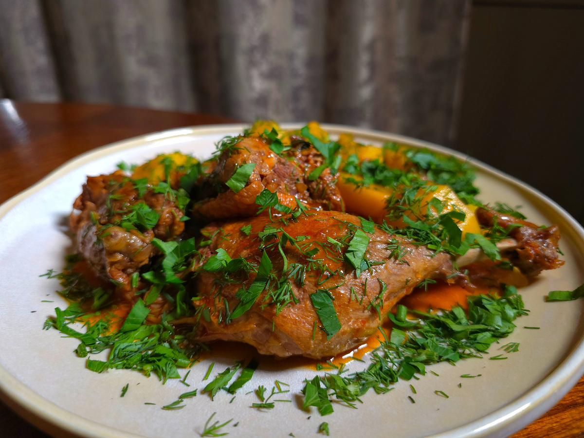 Иногда у меня спрашивают, зачем ты постишь такие простые рецепты, ведь их все знают? Отвечу, как человек, который так же, как и вы, листает ленту постов, смотрит видео. Иногда мы просто забываем о простейших, но вкусных блюдах. Я например часто готовлю одно и то же, забывая о другом. Элементарно например, о вареной картошечке, со сливочным маслом и укропом, и к этому великолепию нарезанная селёдочка🥰 И тут в ленте мне попадается пост с этим блюдом, я понимаю, что давно это не готовила и делаю😁 То есть, я получаю идею напоминание, и это хорошо)) Но сегодня не о картошке. Вспомнилось мне тут на днях самое простое рагу с уткой. Напишу свой рецепт, с небольшими дополнениями к классике. Я беру не целую утку, покупаю две ножки и два филе грудки. Ещё нам понадобится лук, в этот раз я брала обычный и немного порея, три веточки сельдерея, чеснок и картофель. Так же я добавляю соевый соус, томатную пасту, лавровый лист, перец горошком и свежемолотый перец. Готовим. Берём толстостенную каст