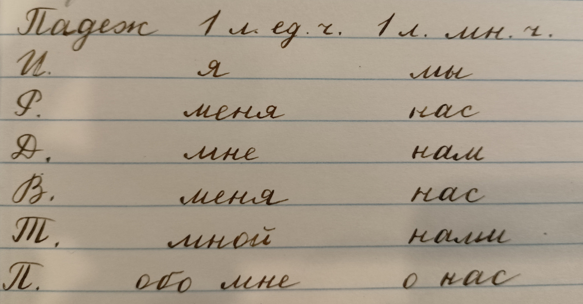 1. Проверка домашнего задания. Упр. 194. Дети читают предложения, которые придумали дома. Над местоимениями указывают лицо и число. 2. Объявление темы урока и актуализация знаний. - Что такое местоимение? - Каким местоимения относятся к первому лицу? Ко второму? К третьему? Местоимения, как и имена существительные и прилагательные, склоняются по падежам. Сегодня мы будем склонять местоимения первого лица. 3. Работа по теме урока. Запишем в тетради таблицу: Откройте учебник на стр. 59. Найдите текст "В мастерской". Устно определим падежи выделенных местоимений. Теперь самостоятельно спишите текст и подпишите падежи. Упр. 198. 4. Домашнее задание. Самостоятельно придумайте предложения с местоимениями первого лица множественного числа.