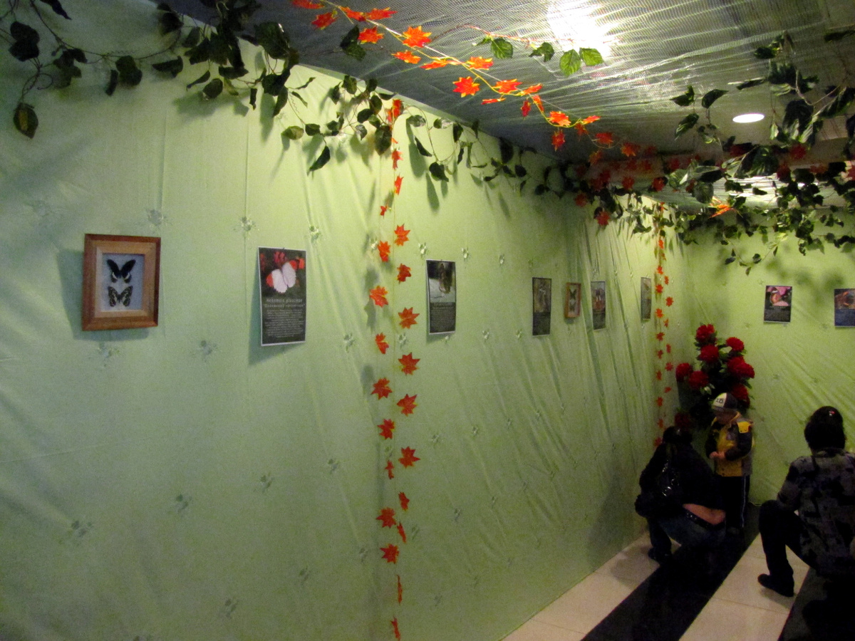 Недавно прочитал новость о том, что у нас в городе во Дворце Спорта им. Балуана Шолака впервые будет проходить выставка тропических бабочек. Конечно тропических бабочек я уже видел в Малайзии. Но захотелось как-то обновить впечатления, да и близко же. Не за четыре тысячи километров, а всего за три квартала. Билеты стоят по 1000 тенге для взрослого, продаются в кассе Дворца спорта. Вход на выставку со стороны улицы Космонавтов. Помещение небольшое. Да и не помещение это, а нечто вроде прямоугольного шатра внутри холла. Билеты нам рвать не стали, потому что объяснили, что бабочки не вылупились и их очень мало. И мы сможем по этим же билетам сходить еще раз попозже, когда их будет много. Ну, в принципе, и так интересно. Хотя думаю, что потом, когда народу будет поменьше, а бабочек побольше — будет еще интереснее. А пока заметка для затравки. Как уже говорилось, помещение небольшое. По стенам развешаны фотографии и экспонаты энтомологической коллекции. Много еще невылупившихся куколок. Тут