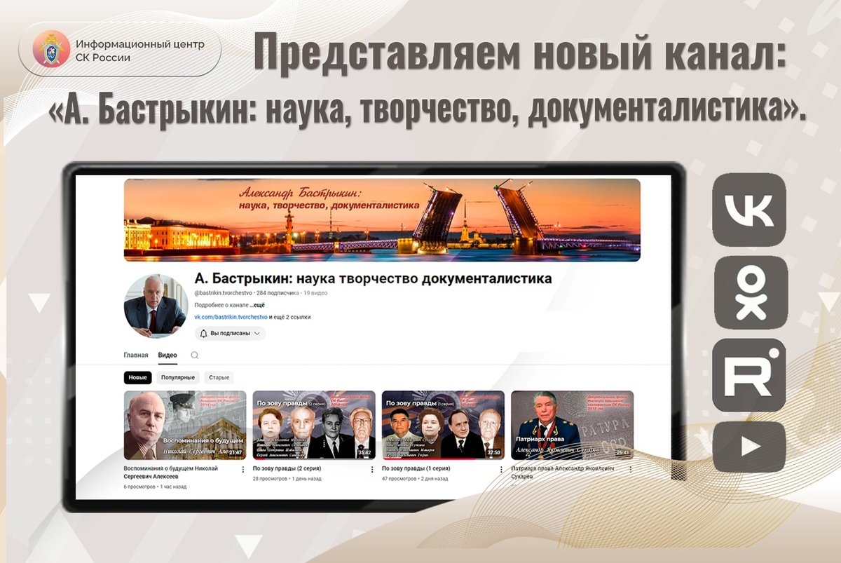 Представляем новый канал: «А. Бастрыкин: наука творчество документалистика». Он будет интересен юристам, историкам, преподавателям и студентам, а также всем, кого занимает тема становления и развития российской государственности и отечественной правоохранительной системы. Кстати, канал ведётся на следующих площадках: Ютуб
