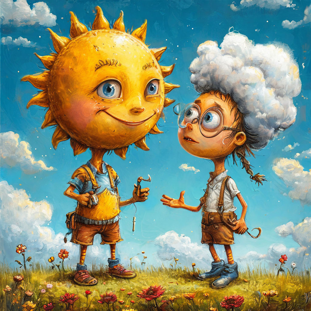 Жили-были в небесном царстве Солнышко и Тучка. Солнышко было золотистое, тёплое и улыбчивое. Оно обожало освещать мир, чтобы всё вокруг росло и радовалось. А Тучка была серенькая, чуть сердитая, и обиженная, потому что ей казалось, что никто не радуется, когда она появляется в небе.