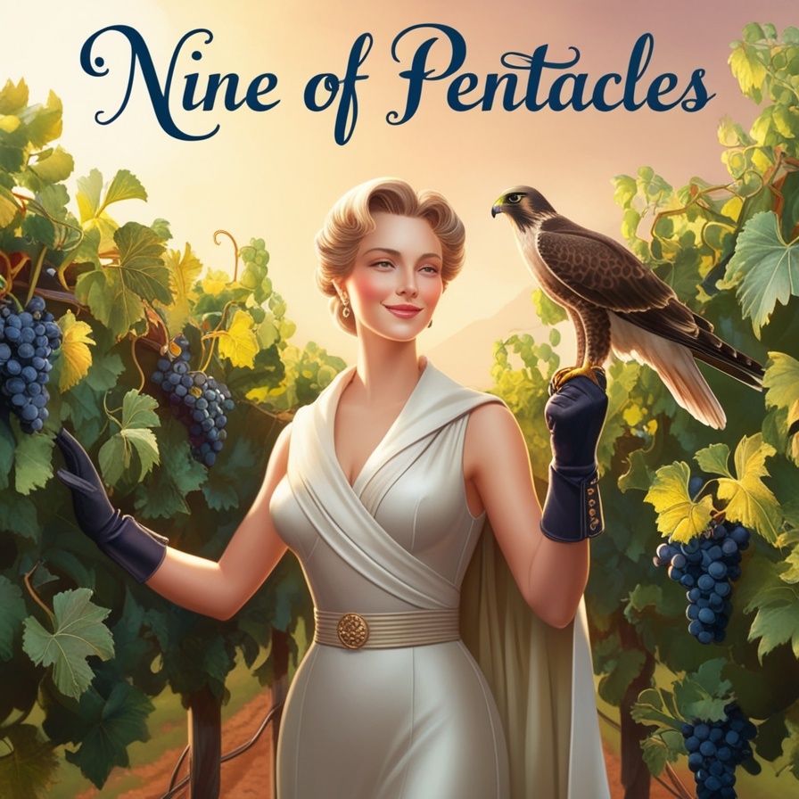 Девятка Пентаклей олицетворяет независимость, стабильность, комфорт, успех и вознаграждение за усилия. Изображенная на этой карте дама богата и одета в изысканные одежды, она прогуливается по своему саду, неся на руке сокола. Ее достижения и процветание подчеркивают виноградные лозы позади нее. Девятка Пентаклей служит мягким напоминанием о том, что основой успешного партнерства является отношение к изобилию. То, чего нет у нас самих, мы не можем предложить другим. Когда мы довольны, мы можем распространять это чувство на других. Крайне важно сохранять индивидуальность даже в паре с кем-то.