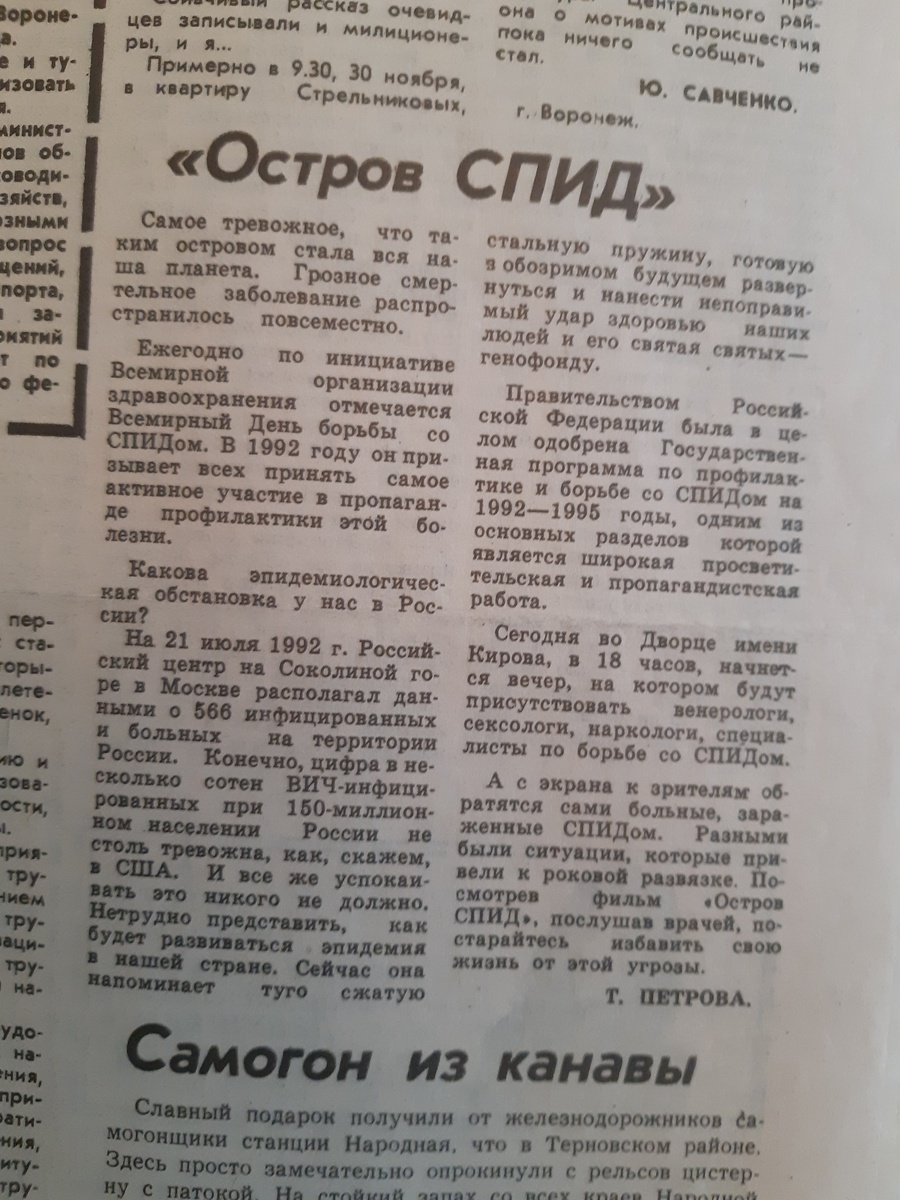 1 декабря весь мир будет отмечать День борьбы со СПИДом. Речь идет о синдроме приобретенного иммунного дефицита. Он является конечной стадией вируса иммунодефицита человека (ВИЧ). Распространяться инфекция по планете начала еще в начале 80-х годов прошлого века. Хотя у ряда исследователей до сих ходят споры относительно времени диагностики так называемого «нулевого» пациента. Первые случаи заражения СПИДом в нашей стране были зафиксированы в период с 1985 по 1987 годов. Заболевание с того времени начало приобретать все более и более масштабный характер. Всему виной были возросшая наркомания, разросшийся рынок эскорт-услуг, распространение нетрадиционных сексуальных связей. К началу 90-х годов СПИД для России и других стран постсоветского пространства стал настоящей бедой. Ровно 32 года назад воронежская газета «Утро» писала о масштабах проблемы. Как отмечала журналистка Т. Петрова, в РФ на июль 1992 года Российский центр на Соколиной горе в Москве располагал данными о 566 инфицированны