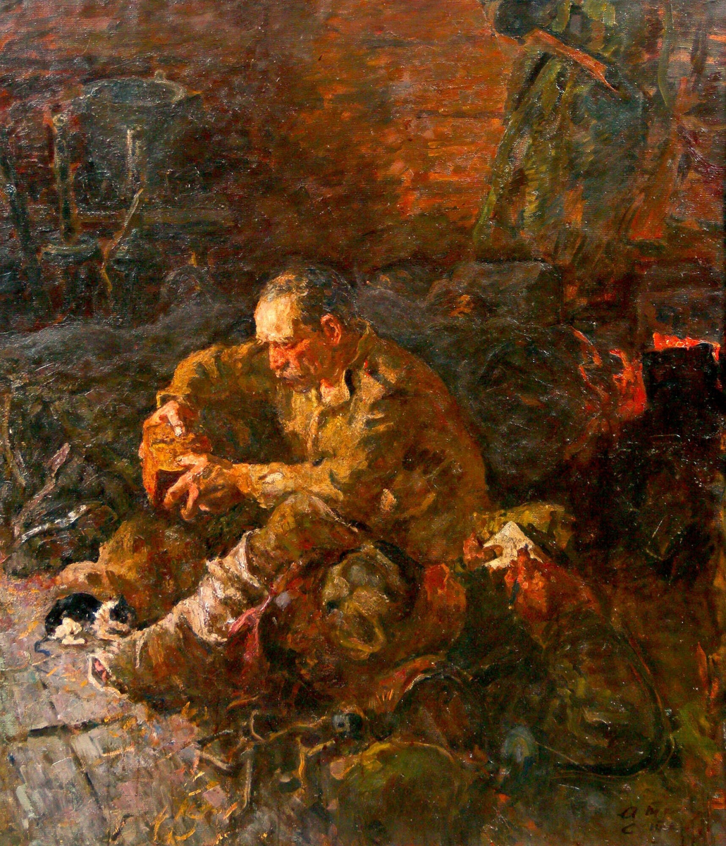 На чёрном от копоти, почти неразличимом на фоне ночи, лице блеснули неправдоподобно яркие белки глаз. Алёхин остановился, замер поражённый. На него смотрел человек сжигаемый и сгорающий нескончаемое количество раз, в только обозначенных контурами лице его было столько лиц, столько образов, столько судеб, что у солдата закружилась голова. Схватившись за виски, Алёхин покачнулся, затопал неуверенно ногами по кружащейся и выскальзывающей из-под подошвы земле.