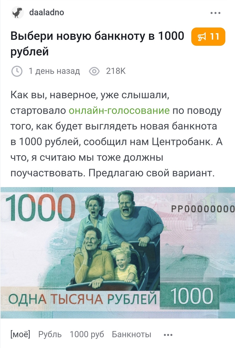 Приветствую вас в своем фейском гнезде! Еду с маркета домой, листаю интернеты, а там оказывается вовсю идет голосование за новый дизайн тыщи. Чем не угодила старая тыща, хотя она вроде и так новая... Может, тут как с жёнами Гордона, загадка. Надеюсь, меня не изобьют авторским правом, но я не могла не поделиться творениями с сайта Пикабу. Я хихикаю на весь вагон метро. Ну и народ от души накидал свои варианты🤣 Это из альтернативной вселенной. Ну тогда такие деньжищи точно был хороший капитал. Командор, мы падаем! Учитывая положение рубля в последние дни актуально. Эту я считаю идеальной и голосовала бы за нее)) А это когда зашел в магазин и увидел цены на масло с яйцами, понял, что надо завести кур на балконе. И правда... Раньше на тыщу полные пакеты выносил из магазина, а теперь камер понатыкали! Не только тыща, предлагали и другие банкноты, например триста рублей. Эта валюта точно была бы популярна. В карман спасибо не пол... А положишь... Ну ладно. Такими можно и зарплату выдавать