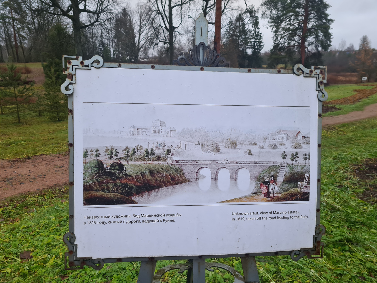 В парке установлены стенды с репродукциями картин художников, писавших в XIX веке пейзажи усадьбы с натуры. По ним посетителям проще представить, как парк выглядел раньше: