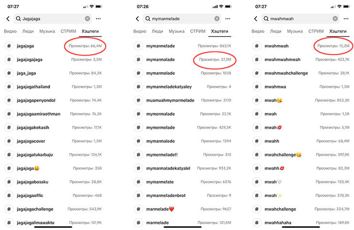 На 4 декабря у роликов с хэштегом #jagajaga – 66,4 миллиона просмотров, с хэштегом mymarmalade – 37,3 миллиона, с хэштегом #mwahmwah – 15,2 миллиона.