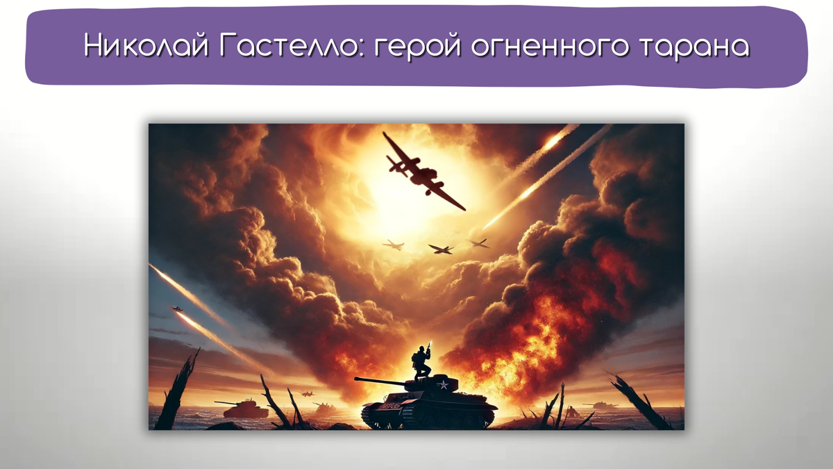 Ну а теперь представьте себя в этом самолёте. Пламя разрастается, жар становится невыносимым. В голове мелькают мысли: всё, конец, прыгать с парашютом, спасаться... Но Николай не думает об этом. В его глазах только цель. Перед ним — враг. В этот момент он понимает, что может сделать что-то невероятное. Что-то, что перевернёт ход боя. Пойти на огненный таран.