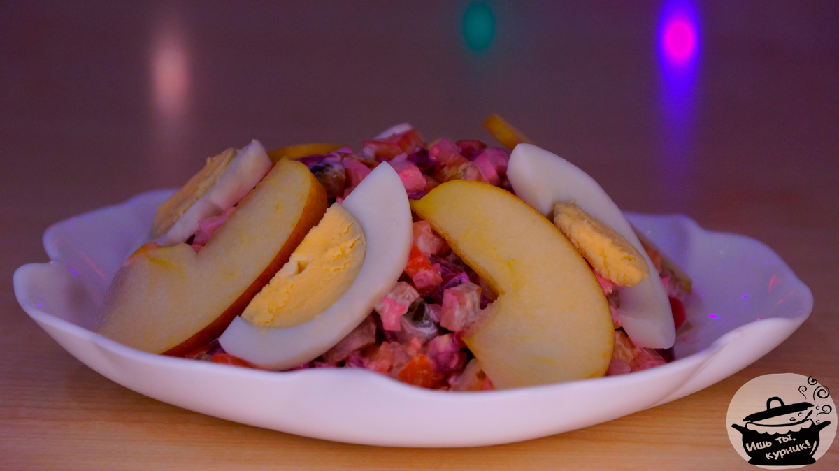 Салат по рецепту "Кулинарии" 1955 г. Вареные морковь и картофель, свежие, маринованные или соленые огурцы, яблоки и филе сельди нарезать ломтиками (3-4 кусочка сельди оставить для украшения), лук нашинковать. Продукты смешать, заправить соусом майонез; для вкуса добавить столовую горчицу, соль, перец и уксус. Положить салат в овальный салатник горкой, по концам поместить хвост и голову сельди, на середину уложить кусочки сельди и украсить вареными яйцами, ломтиками яблок, листьями салата и кусочками крабов. На салат можно нанести при помощи бумажной трубочки сетку из соуса майонез. Сельдь (филе) 50 г; картофель 30 г; огурцы соленые или свежие 20 г; морковь 20 г; яблоки 25 г; лук репчатый 10 г; яйца 20 г; салат зеленый 10 г; майонез 40 г; горчица 2 г; крабы 5 г; уксус 3%-ный 3 г; перец по вкусу.