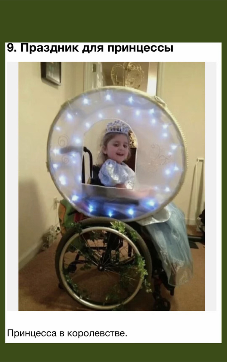 Каждая девочка мечтает быть принцессой. Мечта о волшебной карете, блестящей тиаре и платье, как у Золушки, живёт в сердце каждой маленькой принцессы. Но для этой девочки из фото мечта стала реальностью благодаря её семье и друзьям. Перед вами уникальный момент, который показывает, что никакие обстоятельства не могут ограничить воображение и любовь. Её инвалидная коляска превратилась в настоящую карету, украшенную огоньками и зеленью. На ней надета нежно-голубое платье, а на голове сияет тиара. Её улыбка говорит больше, чем слова: она чувствует себя настоящей принцессой в своём маленьком королевстве. Идея создать эту волшебную карету принадлежала её родителям. Они знали, что их дочь всегда мечтала почувствовать себя Золушкой. И когда наступил её праздник, семья решила подарить ей не просто день рождения, а настоящий день волшебства. Друзья и близкие помогли воплотить идею в жизнь. Они украсили её коляску светящимися гирляндами, добавили детали, которые превратили её в сказочную карету
